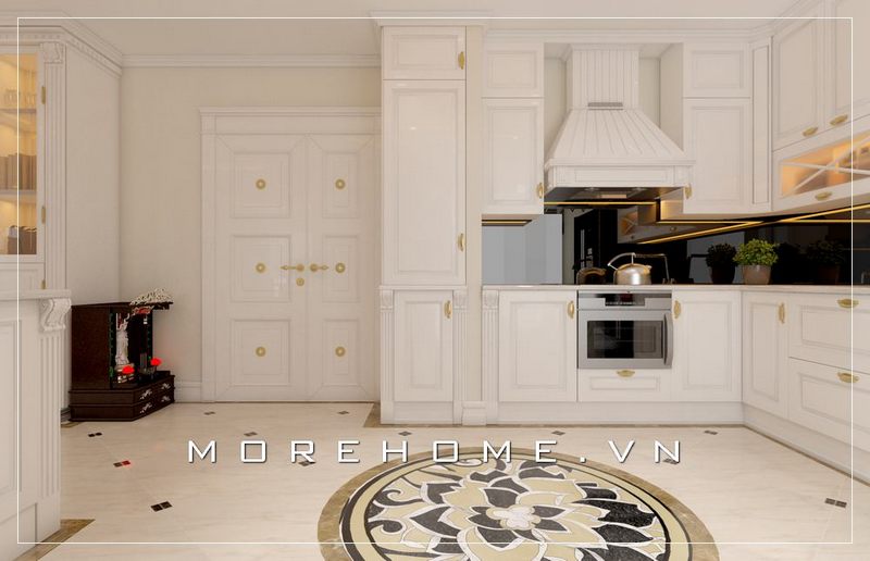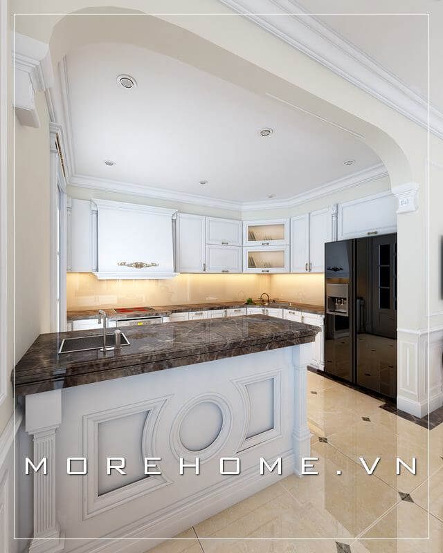 Mẫu tủ bếp gỗ tự nhiên màu trắng tân cổ điển, mặt tủ bếp ốp đá màu nâu vàng cao cấp thể hiện không gian nấu nướng sạch sẽ, thoáng mát và đẳng cấp