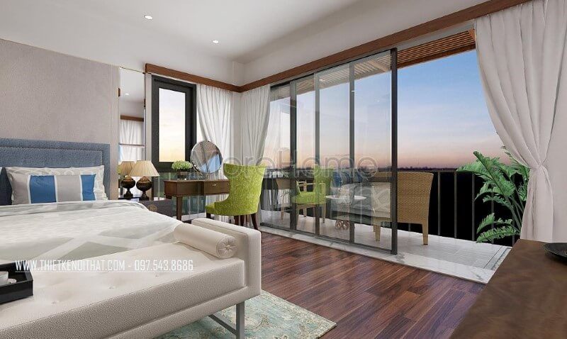 Thiết kế nội thất phòng ngủ vợ chồng hiện đại có ban công thông thoáng, đẹp mắt.