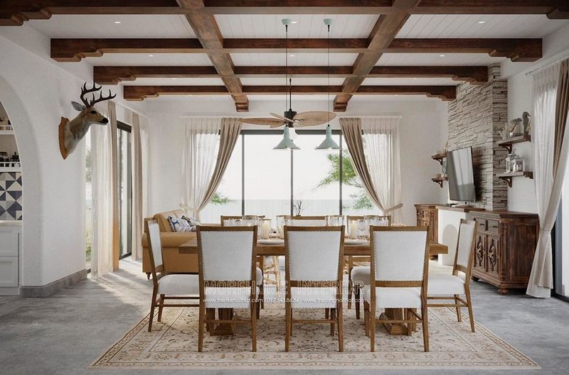 Trang trí nội thất phòng ăn đẹp và tiện nghi, chết liệu gỗ óc chó chủ đạo được gia chủ lựa chọn với gam màu nâu trầm mang lại cảm giác ấm cúng và sang trọng hơn cả
