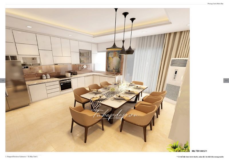 Bàn ăn lớn với 8 ghế hiện đại đặt trong không gian phòng bếp tiện nghi của chung cư, biệt thự, nhà phố vừa tiết kiệm diện tích vừa dễ sinh hoạt.