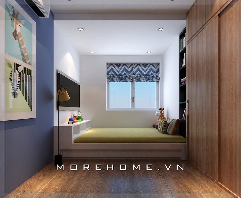 Giường ngủ trẻ em gỗ công nghiệp được thiết kế theo phong cách hiện đại, trẻ trung, KTS lựa chọn gam màu trắng đồng bộ với nội thất khác trong căn phòng tạo nên sự thoáng đãng hơn cho căn phòng ngủ nhỏ