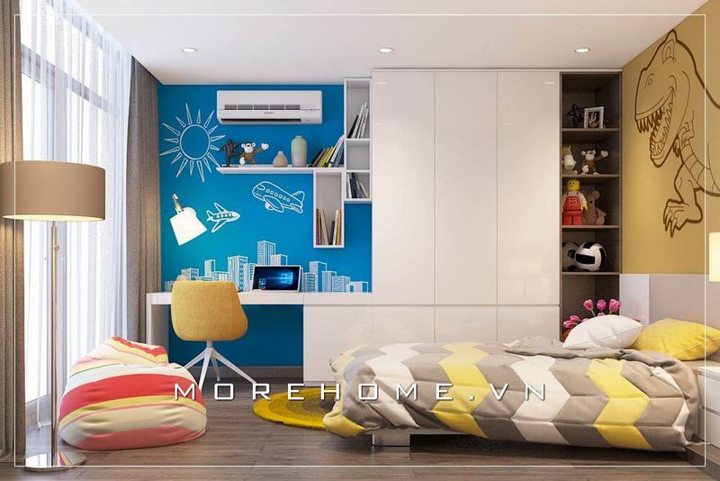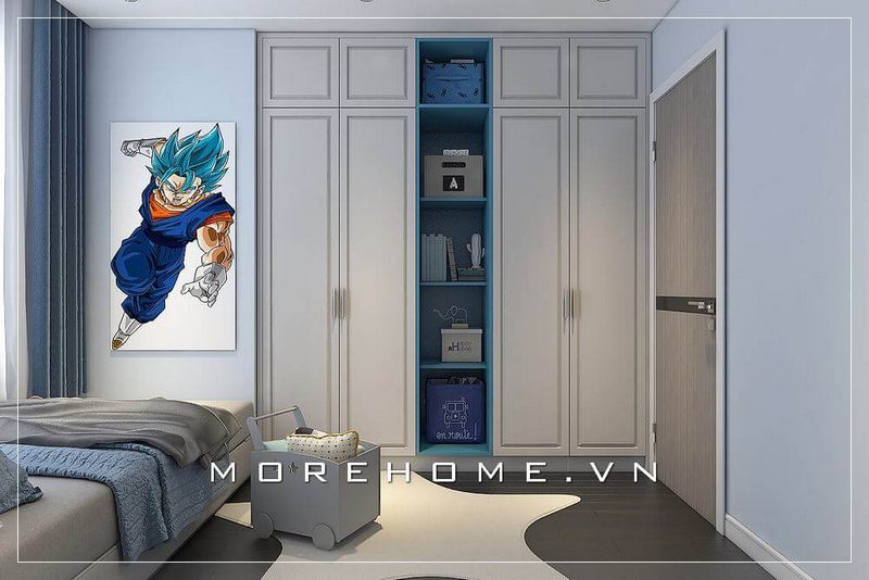 Mẫu tủ quần áo bé trai hiện đại cánh mở hiện đại kết hợp nhiều công năng như kệ trang trí, kệ sách, bàn học mang đến sự tiện nghi nhất cho bé