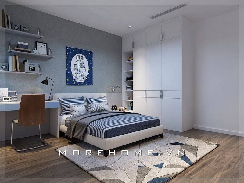 Mẫu tủ quần áo hiện đại kết hợp kệ sách mang lại không gian ngăn nắp, gọn gàng và thuận tiện hơn cho phòng ngủ bé trai