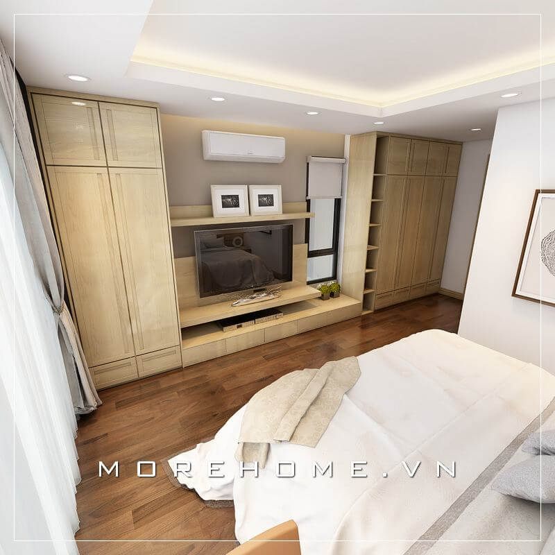 Mẫu tủ áo gỗ cánh đôi hiện đại kết hợp kệ ti vi là giải pháp hoàn hảo lựa chọn cho phòng ngủ nhỏ