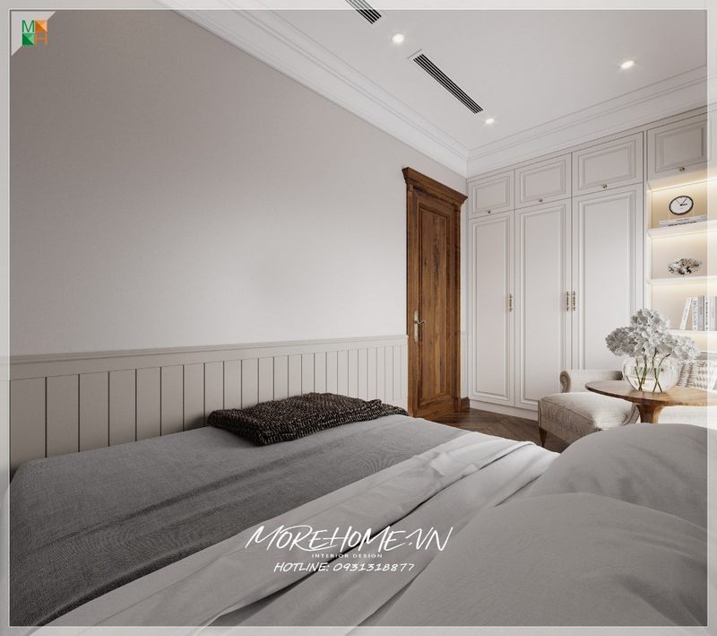 Không gian phòng ngủ có nội thất đơn giản nhưng có phong cách hiện đại, màu sắc nhã nhặn trung tính đem lại cảm giác hài hòa.